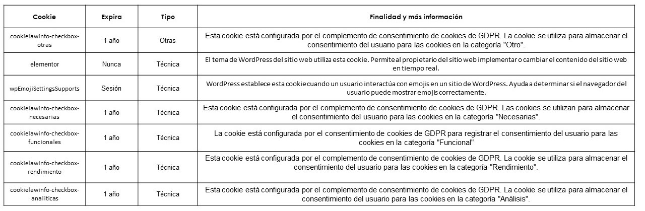 IMPORTANTE: Esta tabla de cookies es necesario que la adaptes y configures con las cookies reales que estés usando en tu web.